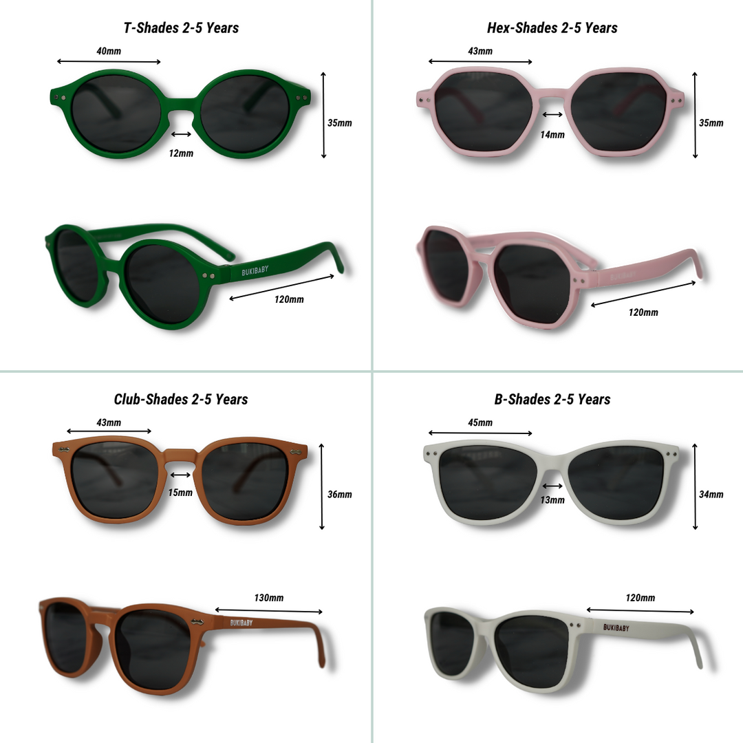 BukiBaby BABY sunglasses are explicitly built for babies ages 0-2 years old. Beware - many "baby" sunglasses on the market are more suited for toddlers and bigger kids. Always check the dimensions! BukiBaby sunglasses have a reduced bridge width and arm length to fit snugly and avoid slipping.
